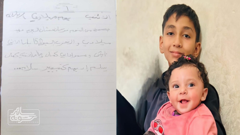 بعد المكالمة الهاتفية بعدة دقائق فقط، تلقى خبر استشهاد طفله مهدي وزوجته. يتابع: “كان مهدي يكتب مذكراته منذ وقت، وحكى عن ذكرياته في عيد ميلاده الأخير في الرابع من آذار/ مارس 2024م، كان يكتب المأساة بصوت الطفولة، “كي لا ينسى ما مر به يومًا وقت الرخاء ربما”.