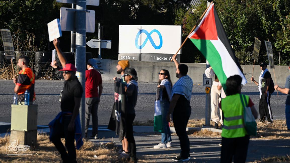 (احتجاجات أمام مقر شركة ميتا (ولاية كاليفورنيا، الولايات المتحدة) في 12 ديسمبر 2023 تندّد بإزالة المحتوى المؤيد لفلسطين، Getty Images)