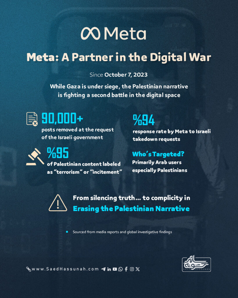 أُعدّت هذه الدراسة من قبل المختص في وسائل التواصل الاجتماعي سائد حسونة، وتتناول تحليلًا شاملًا لدور شركة ميتا في قمع المحتوى الفلسطيني بعد 7 أكتوبر 2023، من النواحي التقنية والإعلامية والقانونية، مع عرض موثق للبيانات، والمقارنة مع سياسات منصات أخرى.
