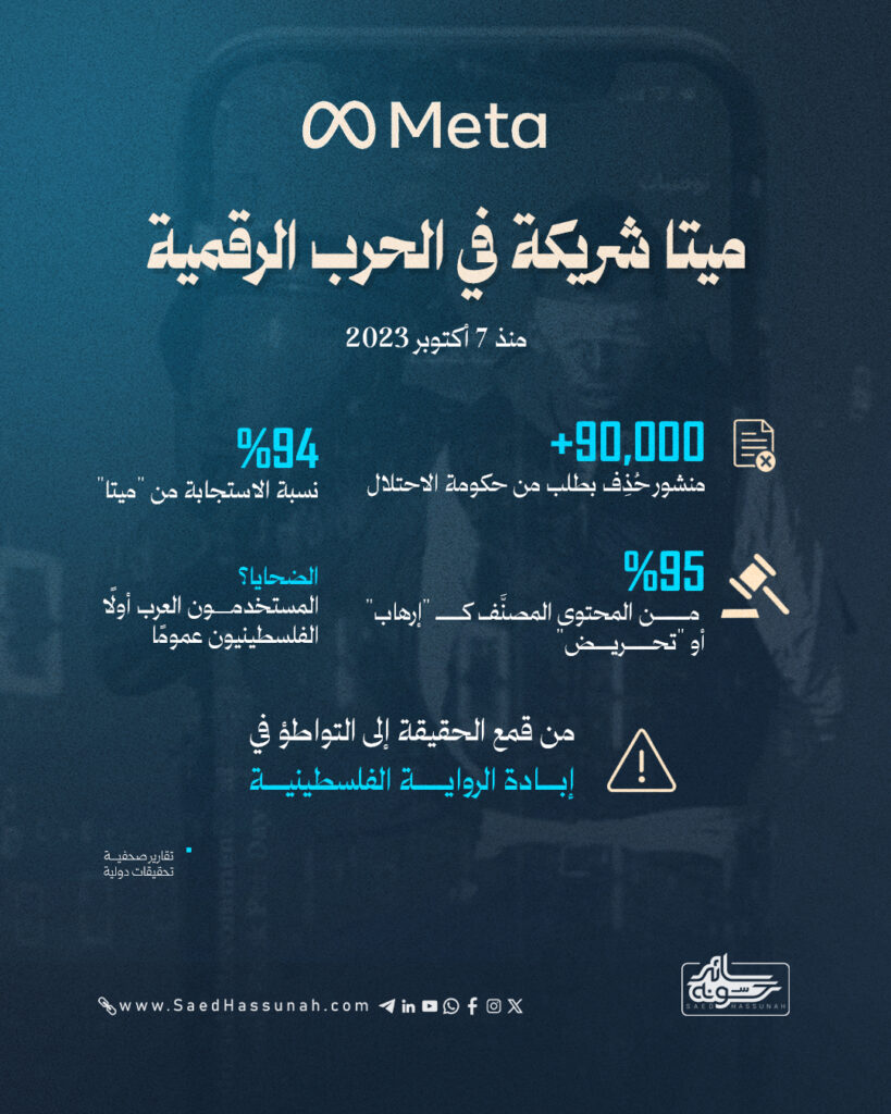 - معدل استجابة ميتا للطلبات الإسرائيلية: استجابت الشركة لـ 94% من أوامر الإزالة التي قدمتها سلطات الاحتلال الإسرائيلي منذ 7 أكتوبر 2023. وهذا معدل امتثال غير اعتيادي يدل على تنسيق وثيق بين ميتا والحكومة الإسرائيلية فيما يخص المحتوى. وقد جعلت هذه الأخيرة نفسها أكبر مصدر لطلبات الإزالة في العالم خلال تلك الفترة.