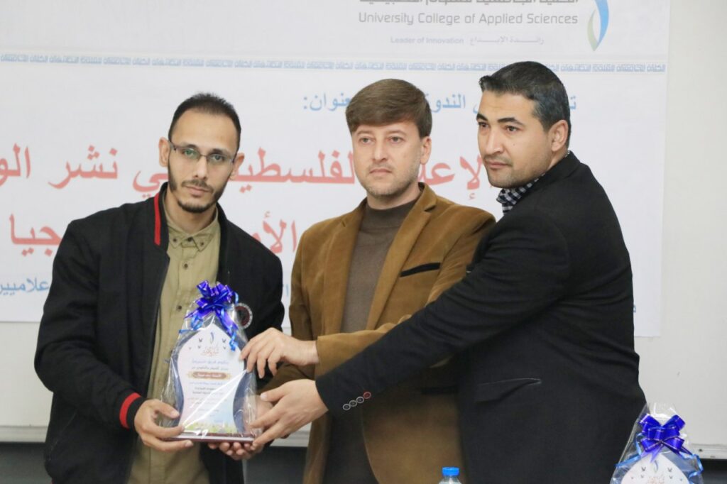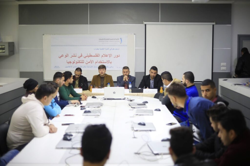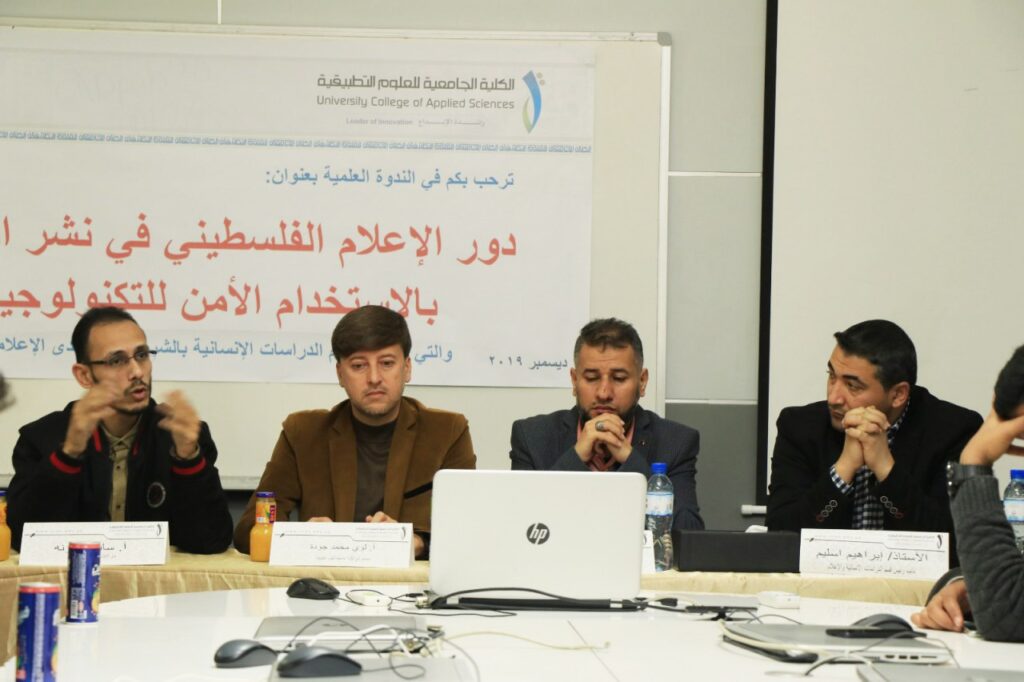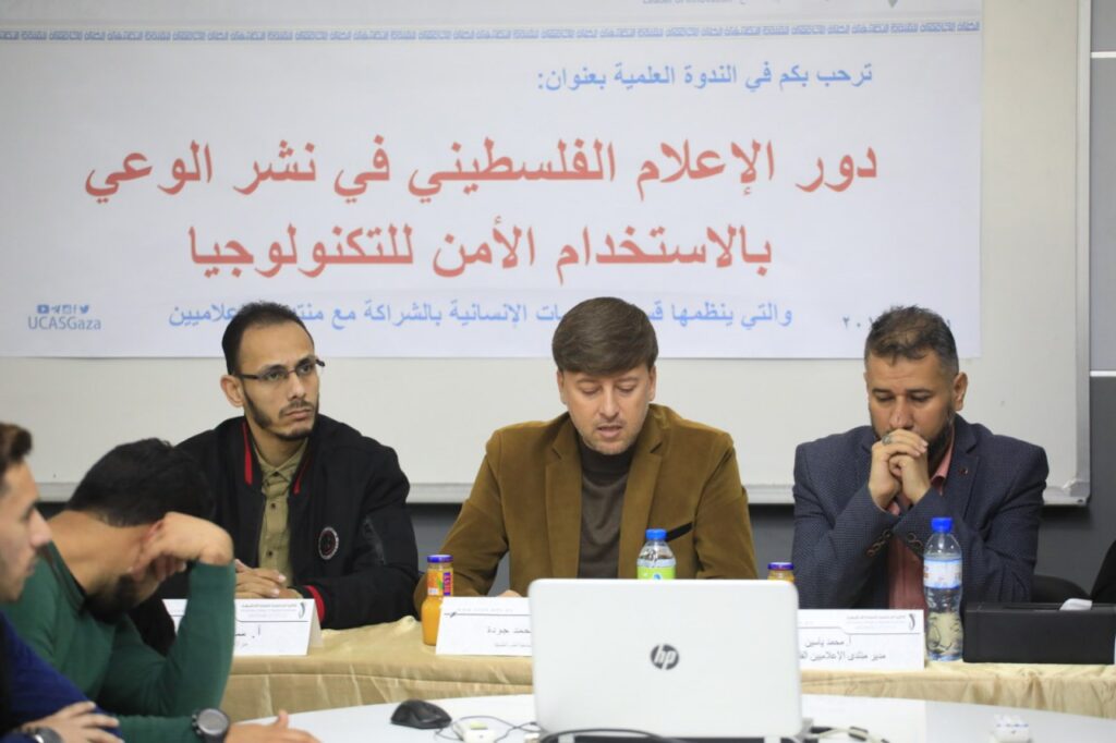ندوة حول “دور الإعلام الفلسطيني في نشر الوعي بالاستخدام الآمن للتكنولوجيا”، نظمها قسم الدراسات الإنسانية والإعلام بالكلية الجامعية للعلوم التطبيقية بالتعاون مع منتدى الإعلاميين الفلسطينيين بقاعة المركز الإعلامي بمقر الكلية بمدينة غزة.